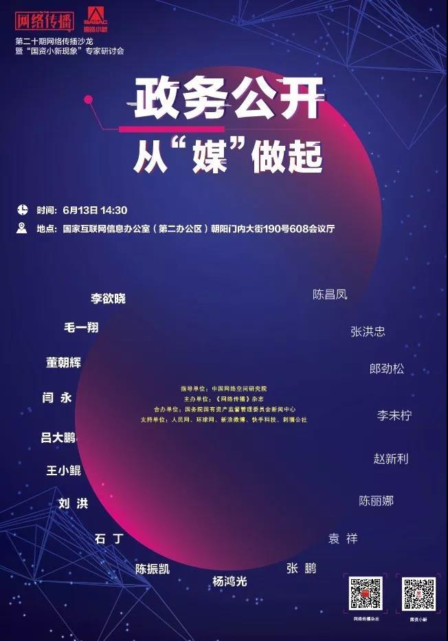6月13日,由中国网络空间研究院指导、《网络传播》杂志主办的第二十期网络传播沙龙暨“国资小新现象”专家研讨会在北京举行,主题为“政务公开,从‘媒’做起”。政企媒学13位业界大咖和知名专家,聚焦“国资小新现象”,以“国资小新”等为研究对象,进行了深入研讨交流,总结政务新媒体运行发展规律,共同探讨政务新媒体如何进一步推动政务公开、提升政务服务能力,走好网上群众路线。