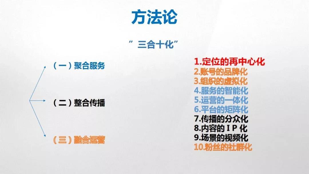 我们把国资小新的运营方法论归纳为“三合十化”。“三合”是聚合服务、整合传播、融合运营,分别对应政务新媒体的服务、传播、互动三大功能。具体可以分解为“十化”: